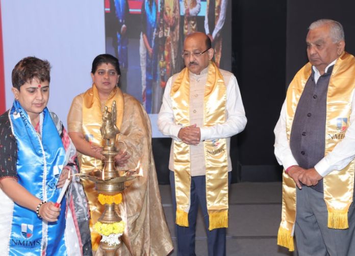 The convocation began with the assembly of the academic procession, accompanied by band music, followed by the lighting of the lamp and the NMIMS anthem. The Nominee of the Hon’ble Chancellor formally declared the convocation open, and felicitated Mr. Bagla with a bouquet and memento. The Nominee of the Vice Chancellor addressed the gathering, highlighting the school’s academic progress, achievements, and milestones over the 2024–25 academic year.