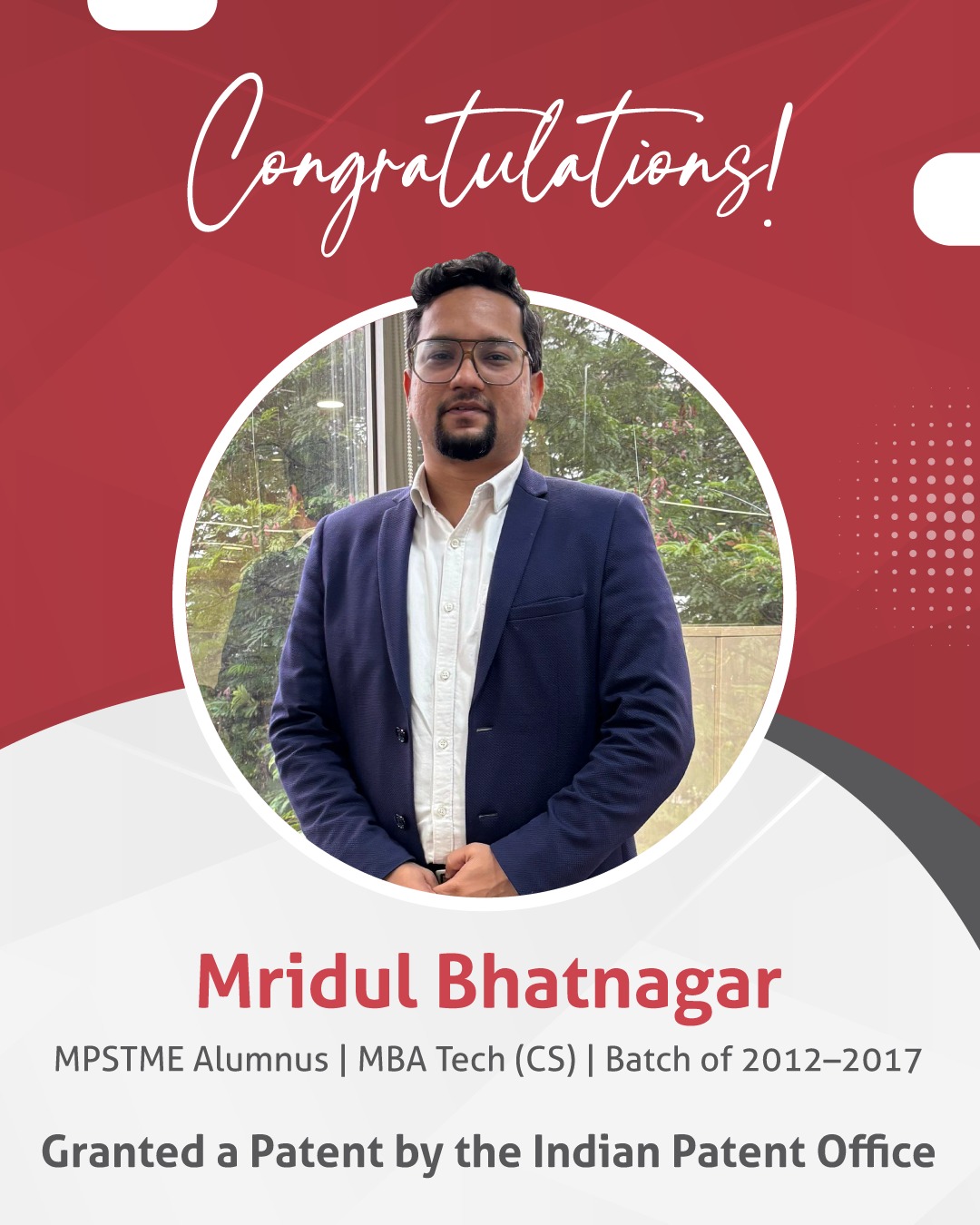 We are proud to share that our esteemed alumni, Mridul Bhatnagar, a graduate of the MBA Tech program from SVKM’s Narsee Monjee Institute of Management Studies (NMIMS), Mukesh Patel School of Technology Management & Engineering (MPSTME), along with his partner and now wife, Mrs. Varnali Sharma, have been granted a patent by the Indian Patent Office (June 2025) for their pioneering invention – an anti-noise pollution device designed to monitor and control excessive honking in vehicles.