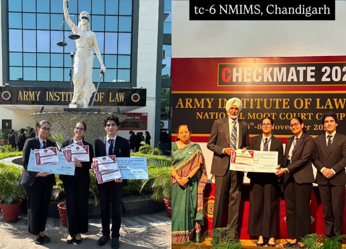 The School of Law, NMIMS Chandigarh, has made the university proud, as its students — Yashita Narwal and Ansh Julka (B.A. LL.B. (Hons.) 2nd Year) and Amrita Kant (B.A. LL.B. (Hons.) 3rd Year), delivered an outstanding performance at the 15th Checkmate Moot Court Competition held at the Army Institute of Law, Mohali, from 6th to 8th November 2025.